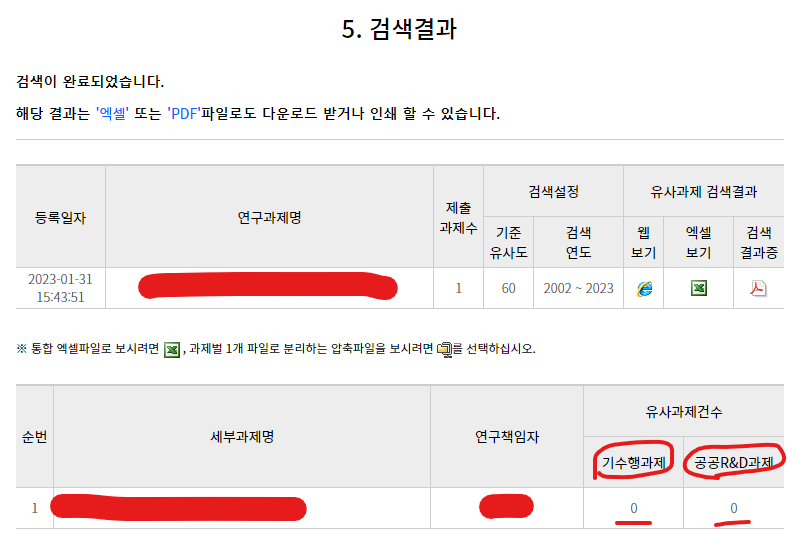 대략적인 연구개발 개요를 열심히 적은 후 다음단계를 누르면 다음과 같이 검색 결과가 나온다.